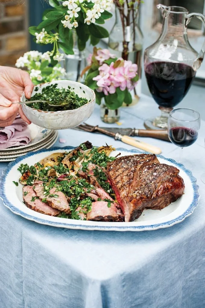 4. Thinly slice the steak, spoon over the chimichurri and serve with the grilled endives